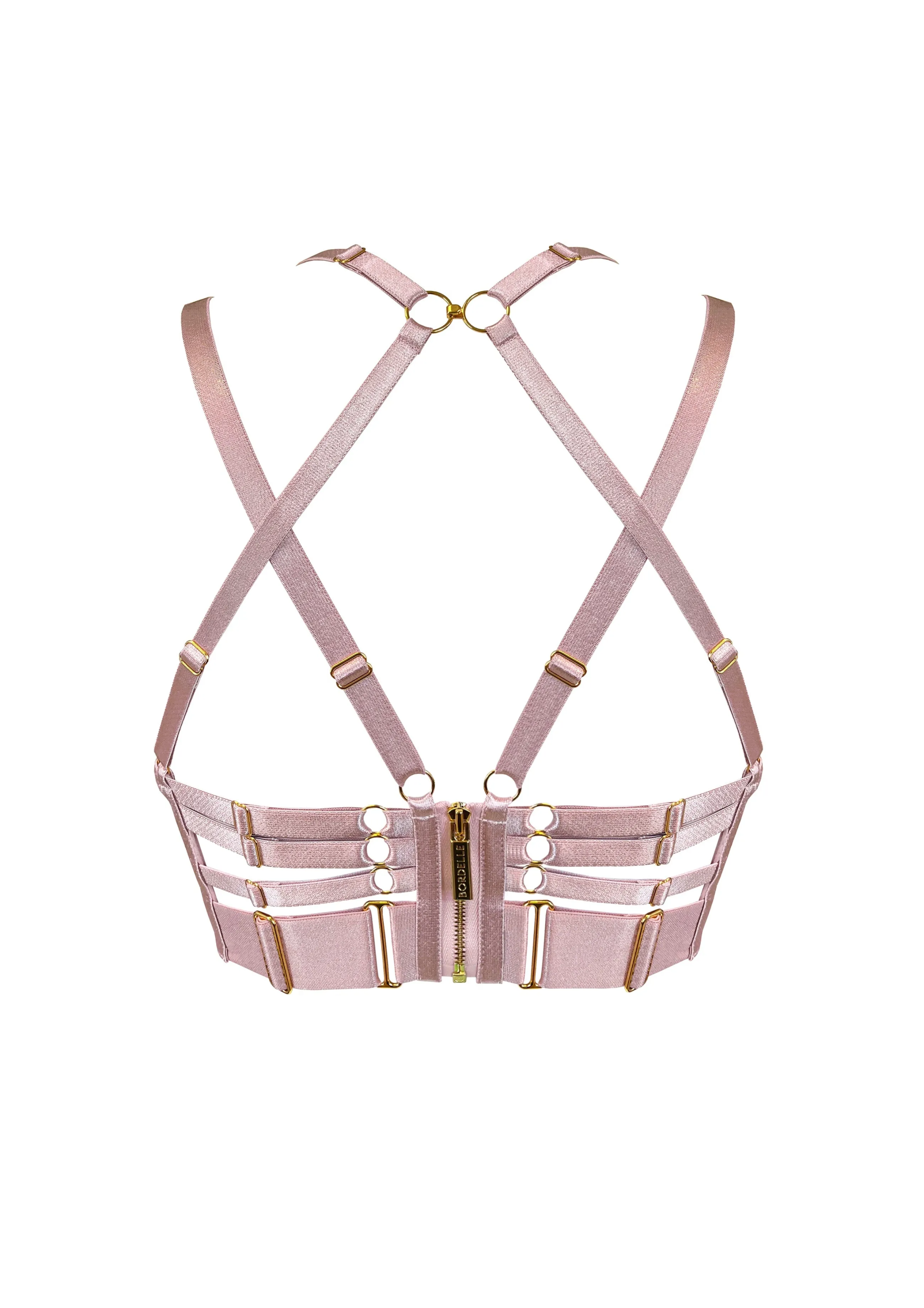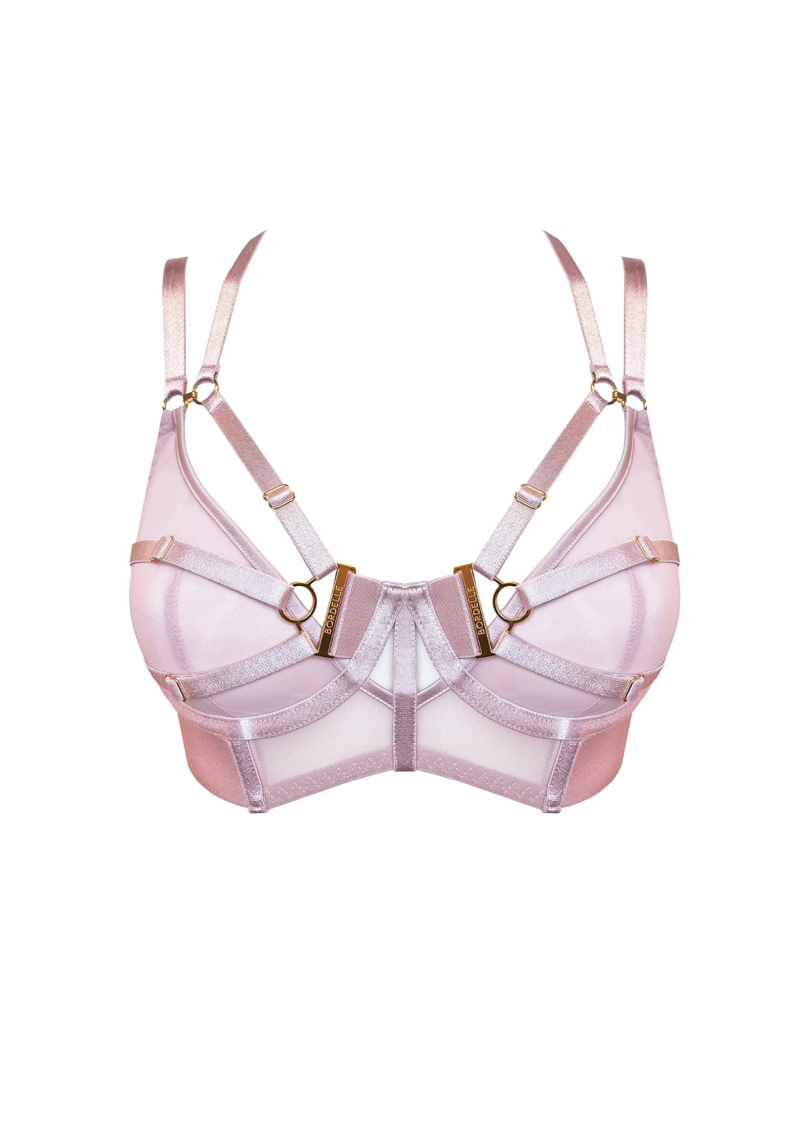 A soft, sheer mesh underwired bodice bra adorned with front harness strap details that extend over the cups. Fully adjustable at the back, this bra is eye-catching from every angle. Available exclusively on our website.