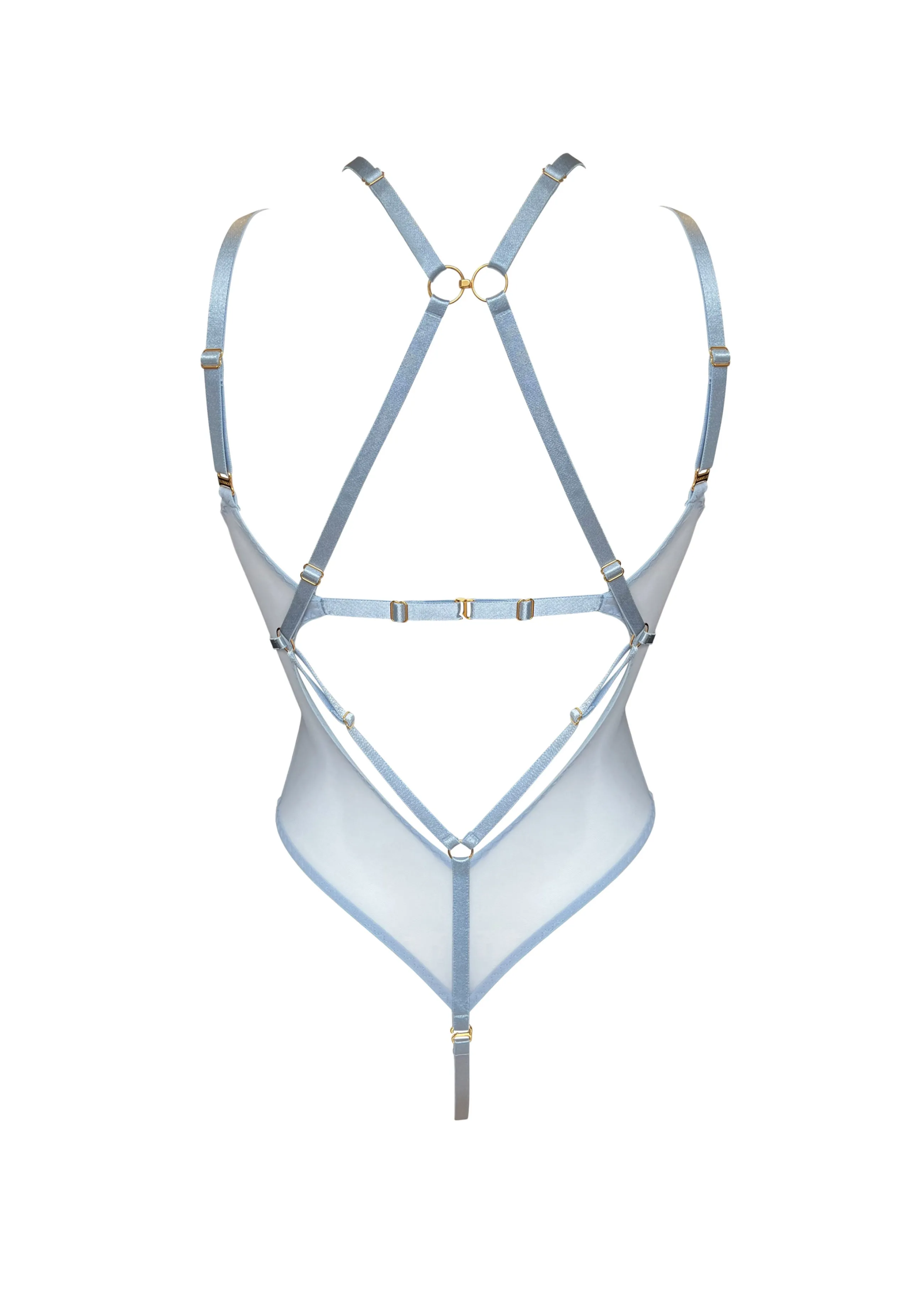 A soft, sheer mesh bodysuit featuring a delicate satin elastic harness and 24k gold plated chain-link component details. Adjustable strapping highlights the bust and continues to the back to create an eye-catching design, securing at the back with a swan hook and ring-hook fastening.
