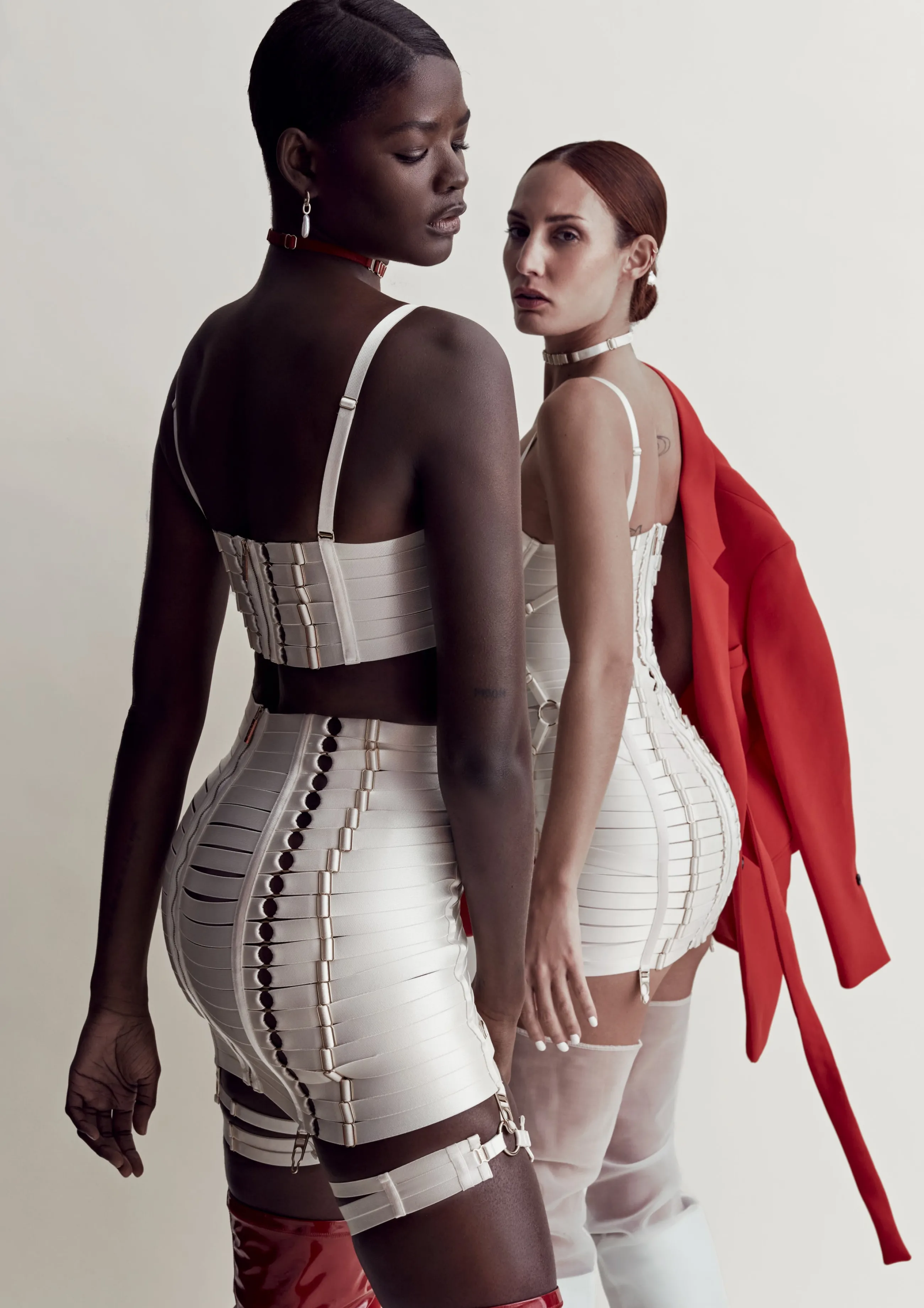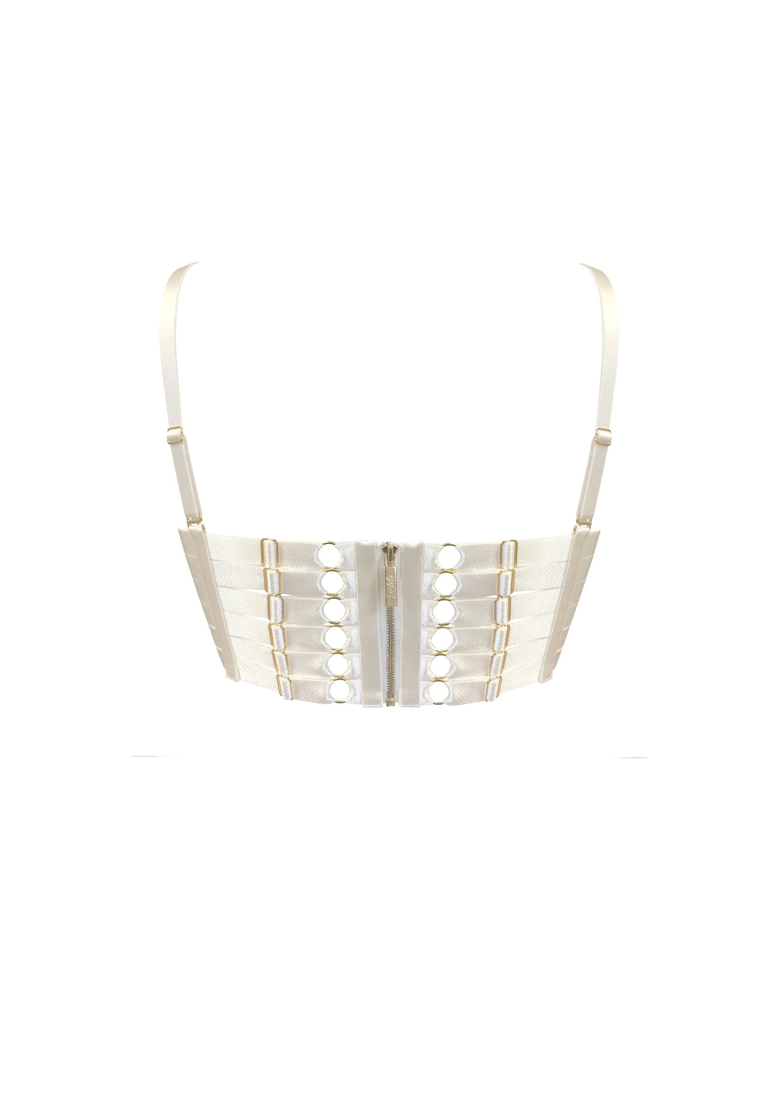 A true Bordelle bodice bra, inspired by our coveted Angela Girdle Dress, and made up almost entirely of luxury satin elastic strapping and 24k gold plated components.