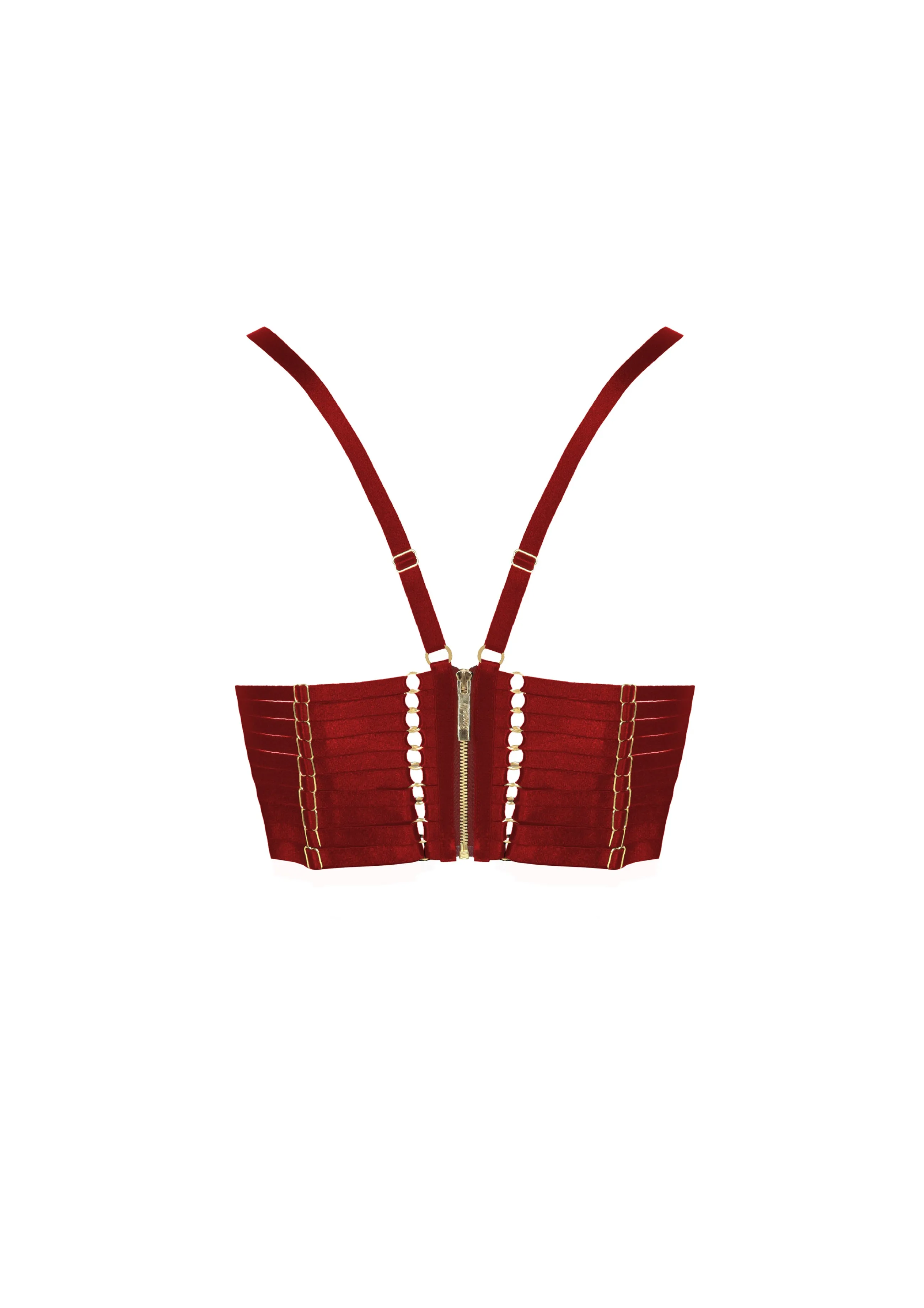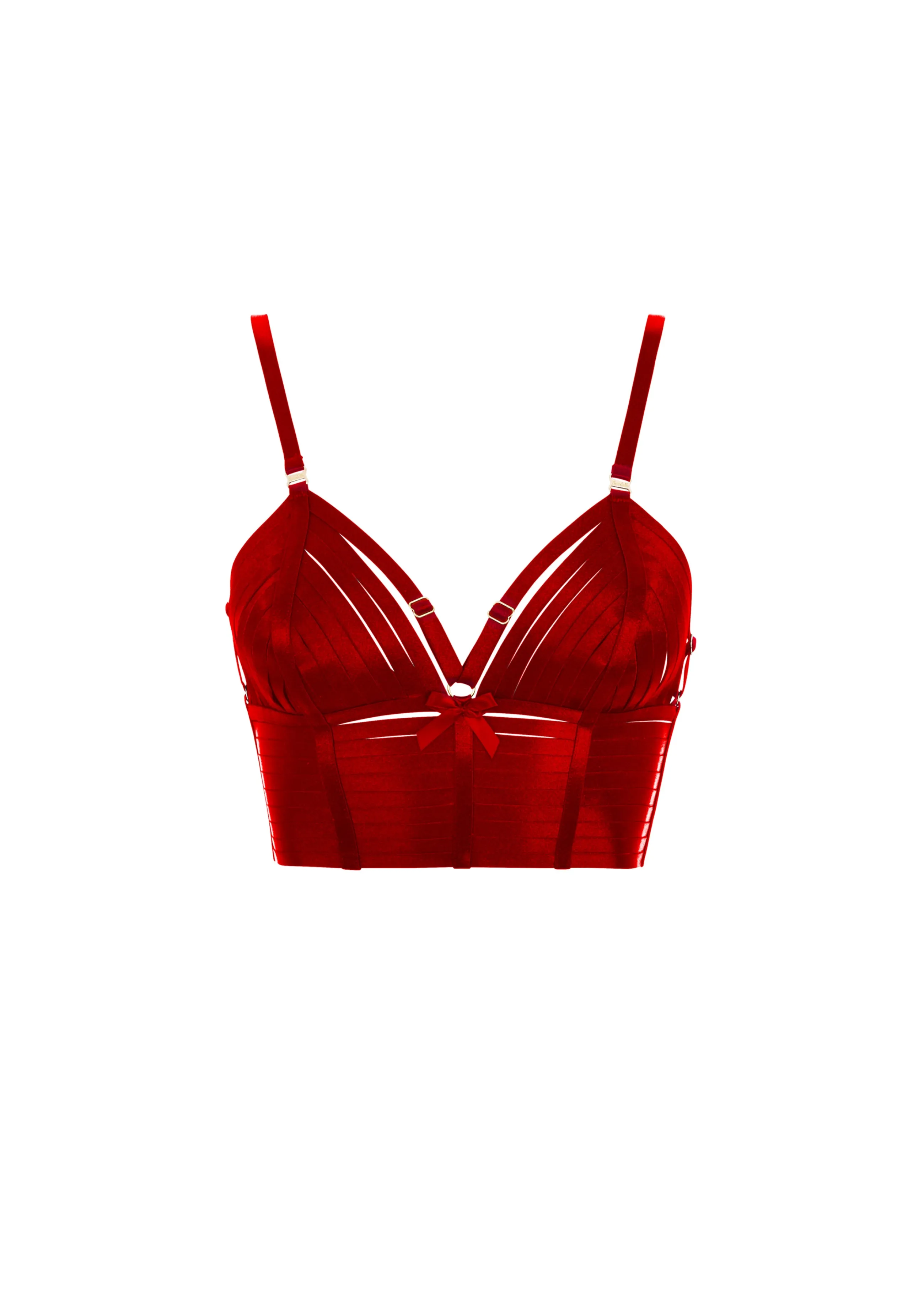 This statement crop top is predominantly comprised of Signature satin elastic strapping, with a soft mesh underlay on the cups. This piece is designed to be seen.