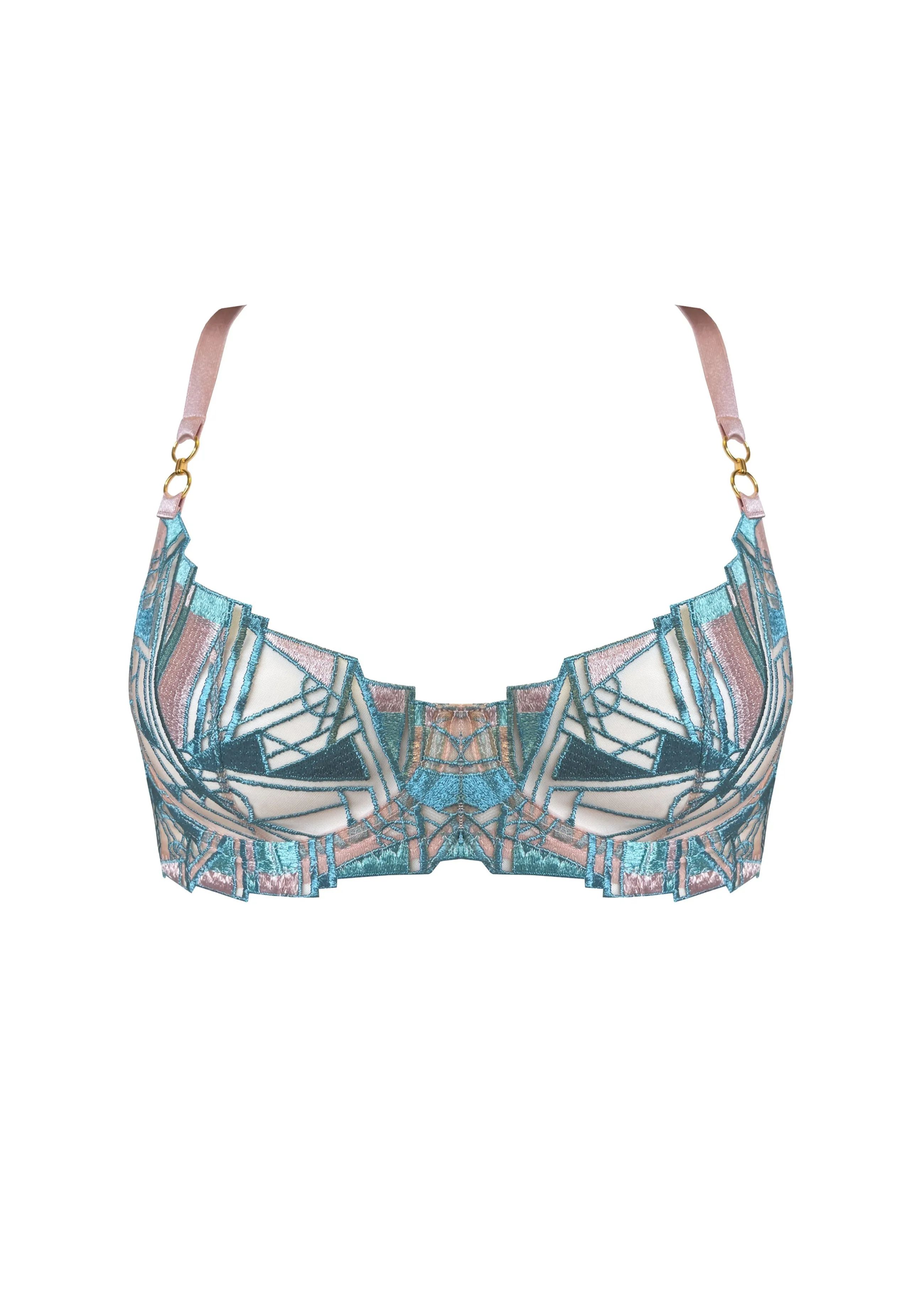 A wired lace bra featuring a Cubism-inspired embroidery design on soft voile, perfect for everyday comfort and wear. Soft wide band elastic strapping adjusts via 24k gold plated components, securing at the back with a 24k gold plated zip fastening.