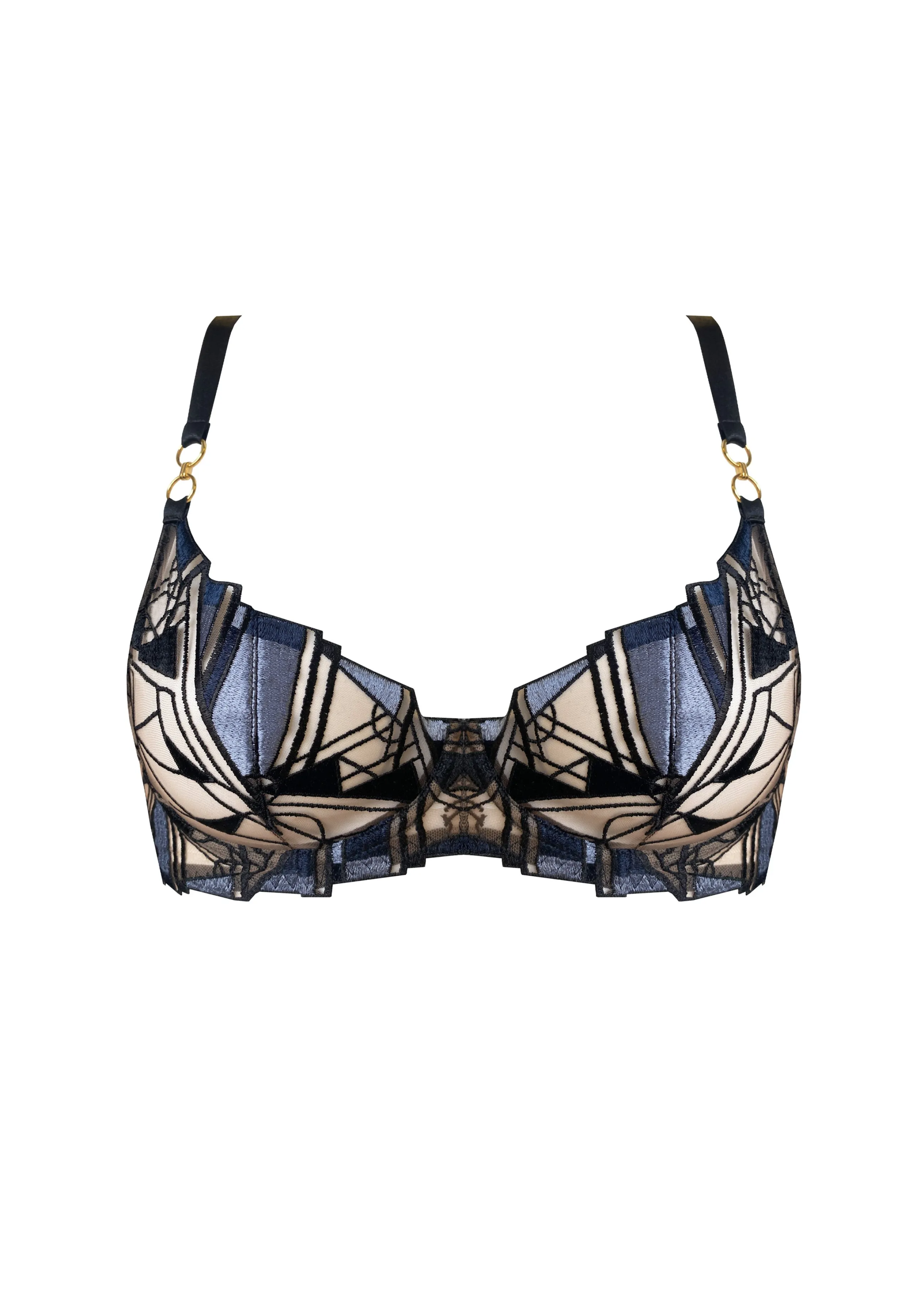 A wired lace bra featuring a Cubism-inspired embroidery design on soft voile, perfect for everyday comfort and wear. Soft wide band elastic strapping adjusts via 24k gold plated components, securing at the back with a 24k gold plated zip fastening.