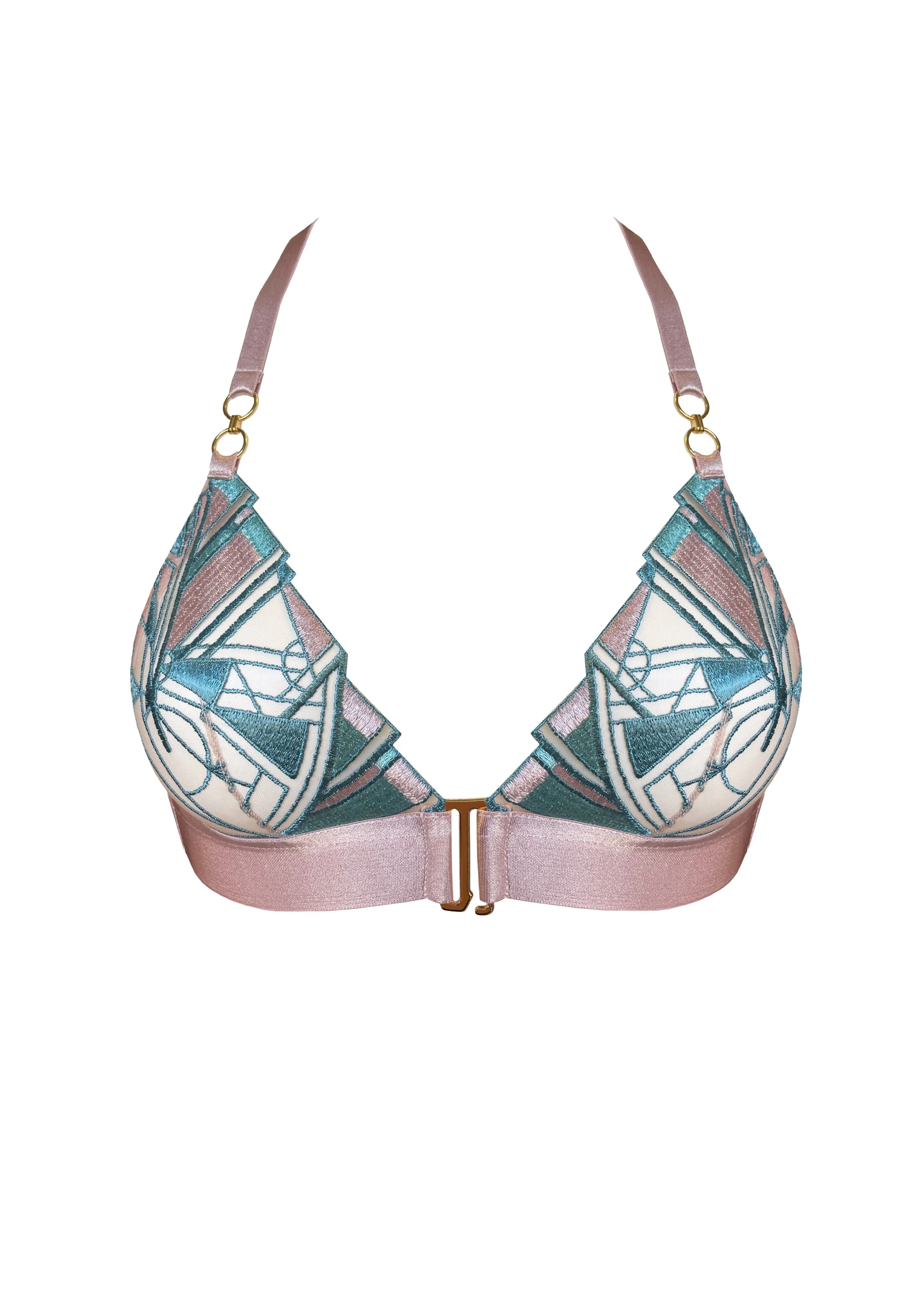 A wearable soft cup triangle bra crafted from geometric embroidered voile featuring a soft wide band elastic underband and single back strap. Fastening at the front with a 24k gold plated swan hook, this style is perfect for everyday wear.