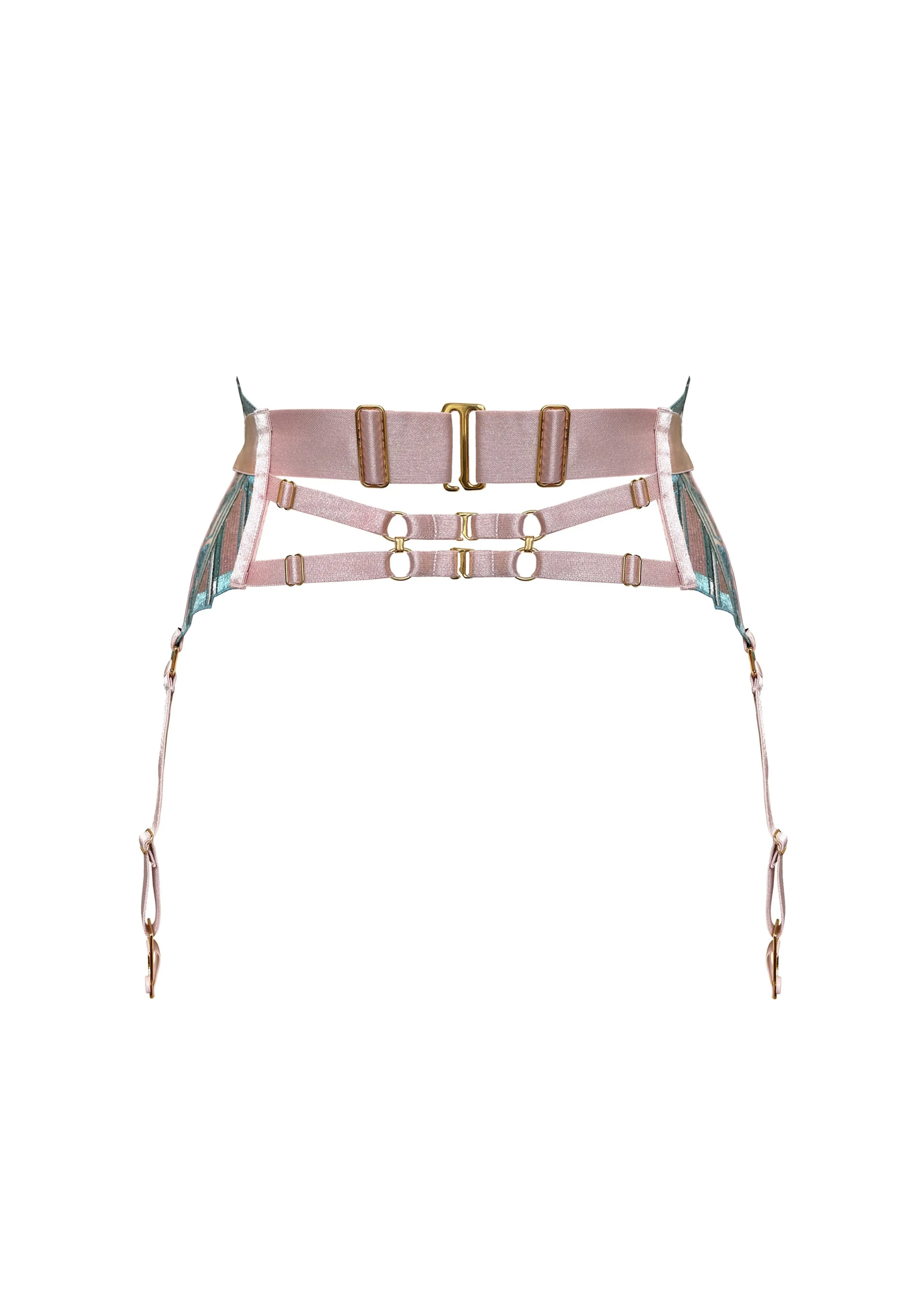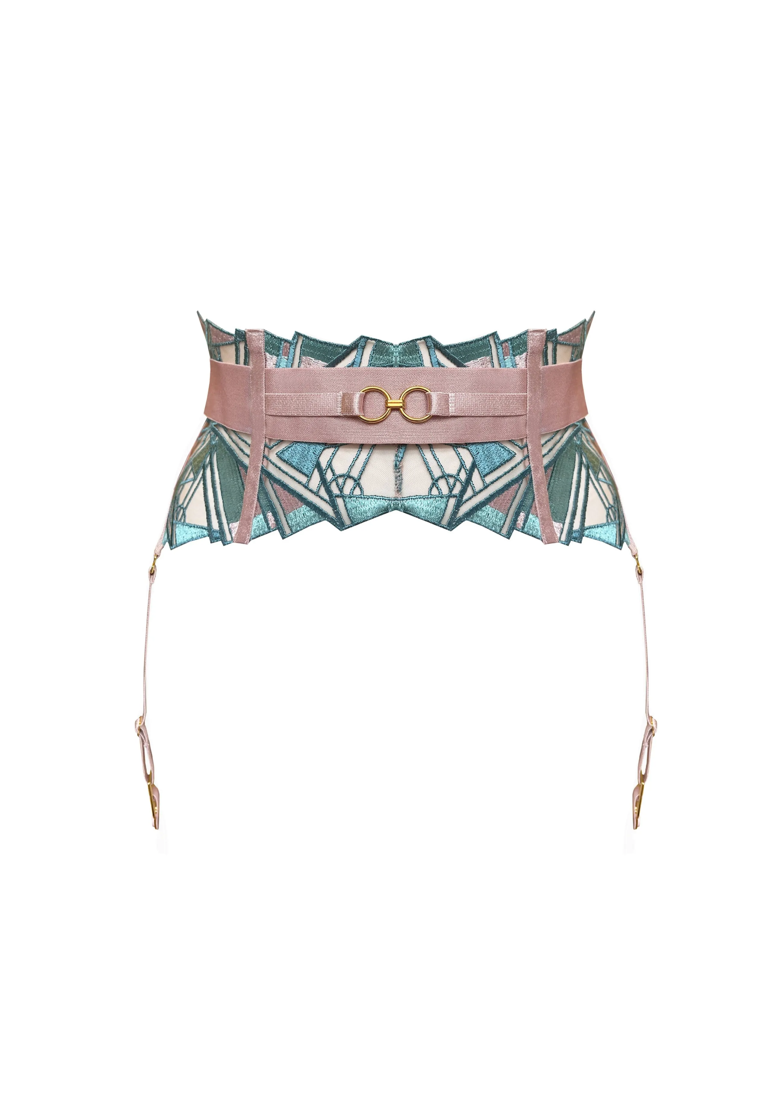This suspender highlights the geometric scallop edge of the embroidered voile, contouring the waist and flattering every curve. Secured to garters or stockings via 6 suspender clips, the 24k gold plated component side detail is guaranteed to attract attention.