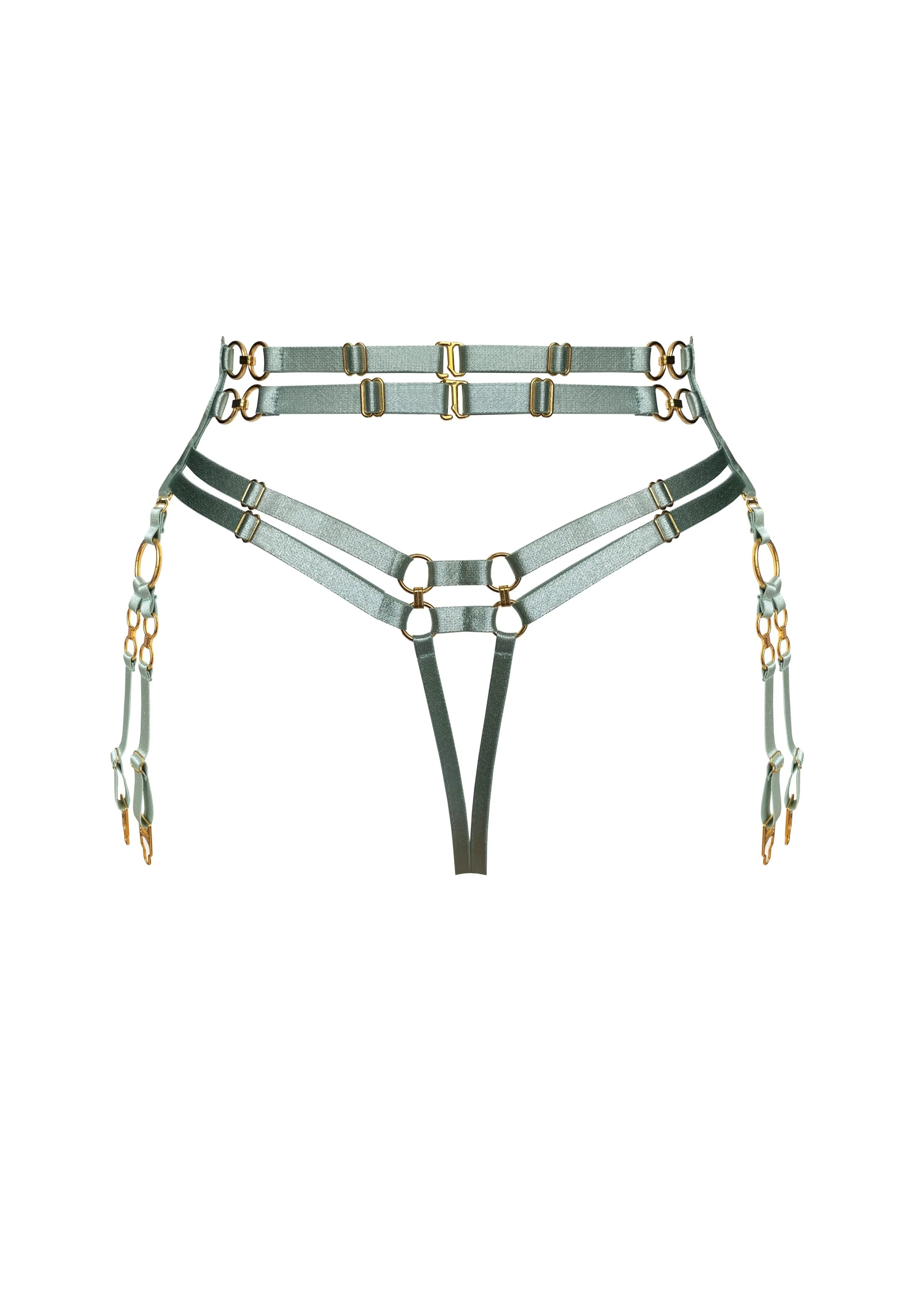 The Cymatic High Waist Thong is designed to elongate your figure, sitting high on the leg this style is sure to impress. Featuring overlaid strap details and an abundance of gold components, this opulent style can be paired with the Cymatic Garters, or detach the suspender straps for a sleek look.