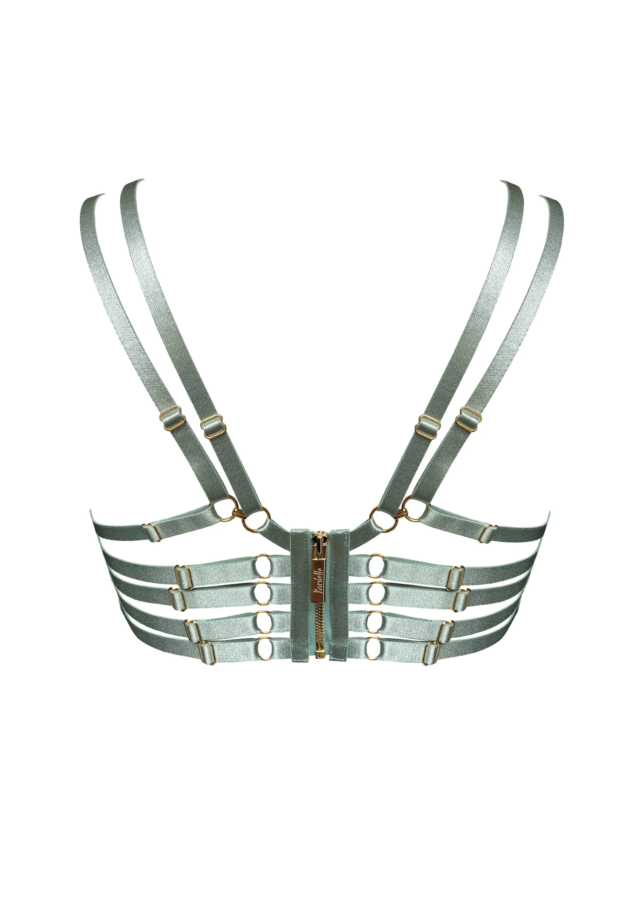 Dare to bare in the Kleio Ouvert Wire Bra. Featuring delicate harness details composed of our classic gold plated ‘O’ ring, new chain-link component and satin elastic strapping, pair with the Kleio Thong and Kleio Suspender for a complete ensemble.