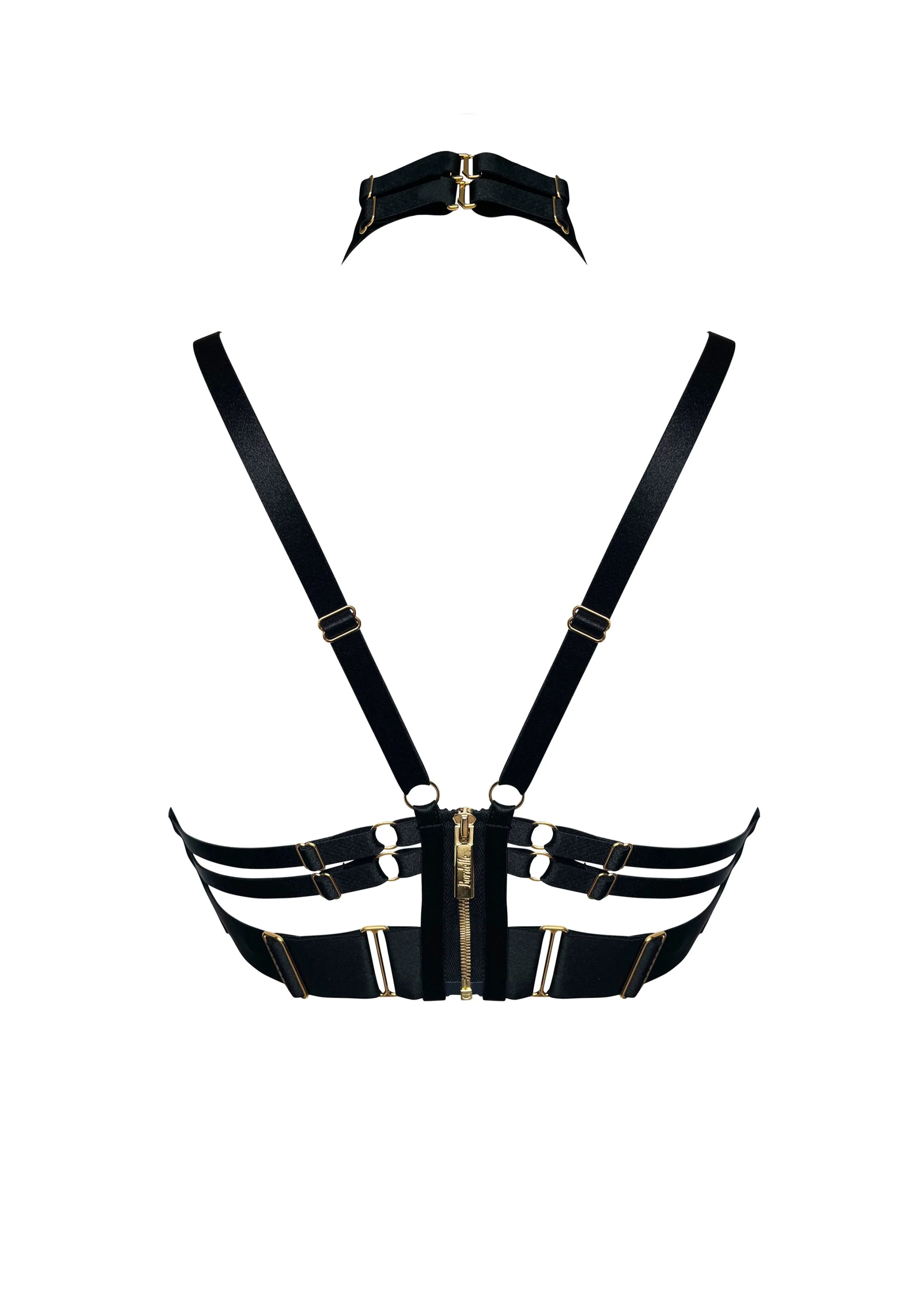 Dare to bare in this fully ouvert wired bra. Complete with embroidered tulle panels and collar detail, this cupless style is designed to be seen. Featuring fully adjustable back straps for a personalised fit, this style is finished at the back with a 24k gold plated zip fastening.