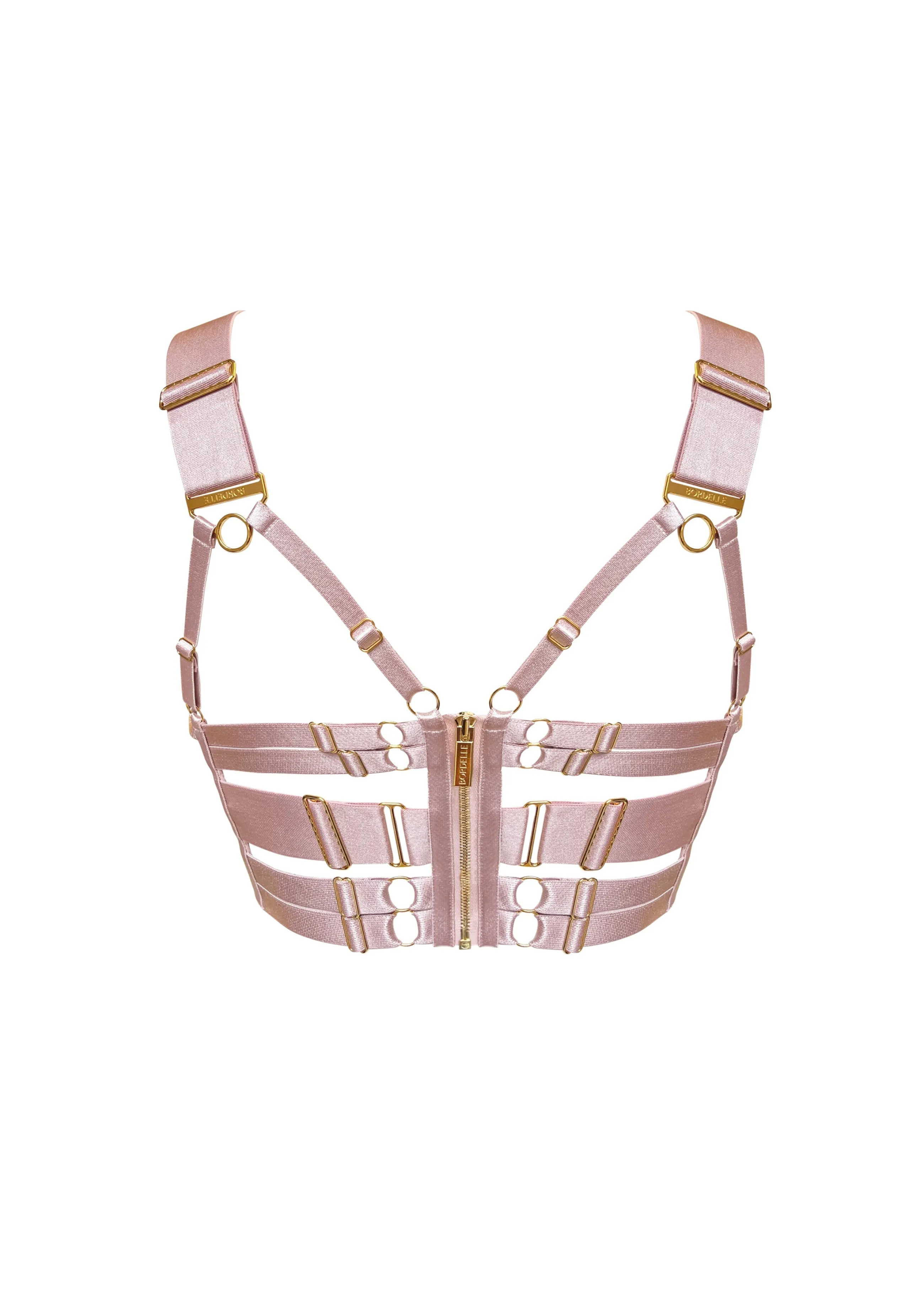 An elevated classic, this structured underwired bodice bra features panelled satin elastic cups and wrap over detailing with soft, wide band elastic. A fully adjustable back for a personalised fit is complete with multiple 24k gold plated components. With full coverage, this is a bra that demands to be seen, perfect for styling as outerwear.