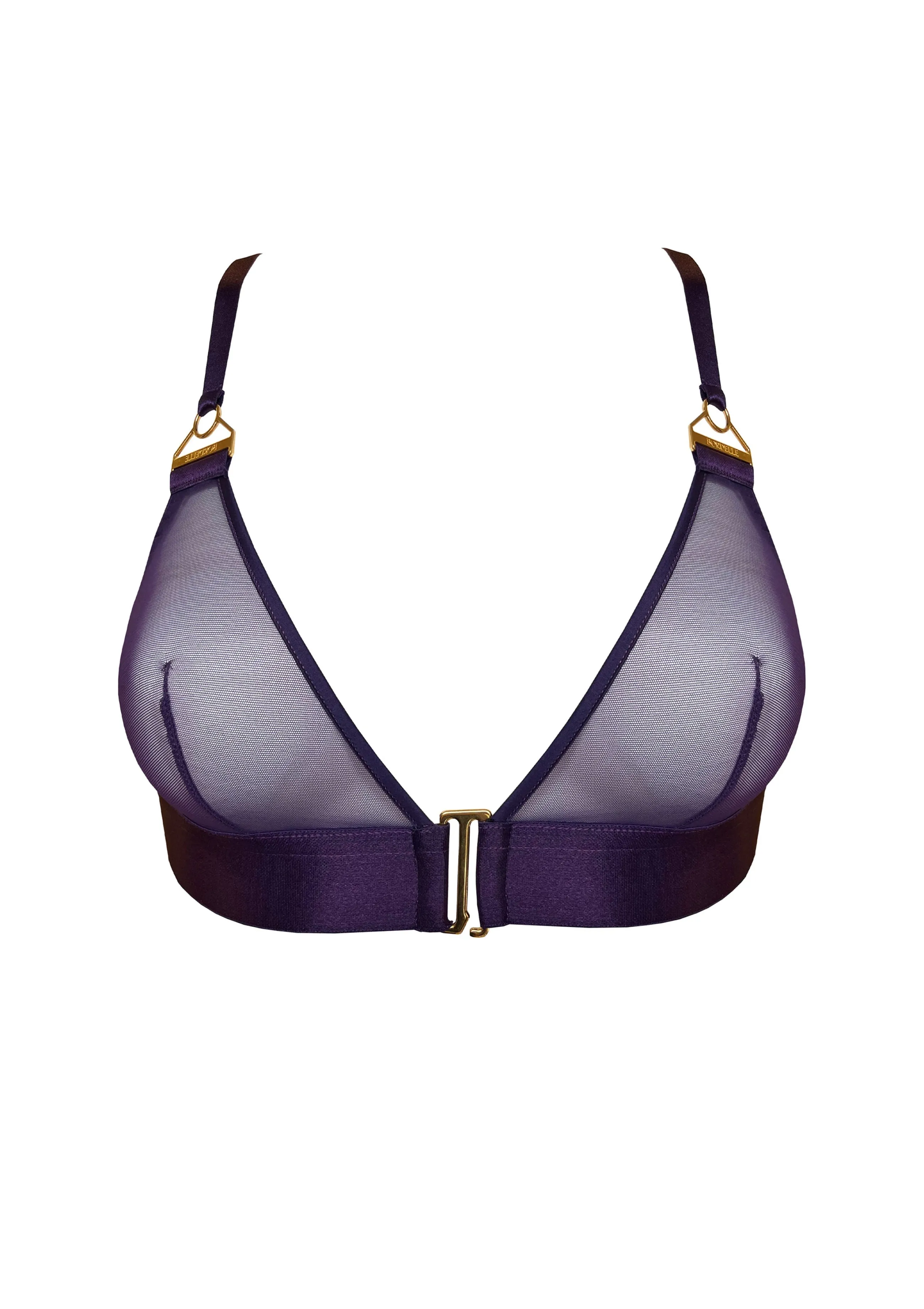 A wearable every day soft sheer mesh triangle bra, elevated with oversized 24k gold plated branded components at the fro…