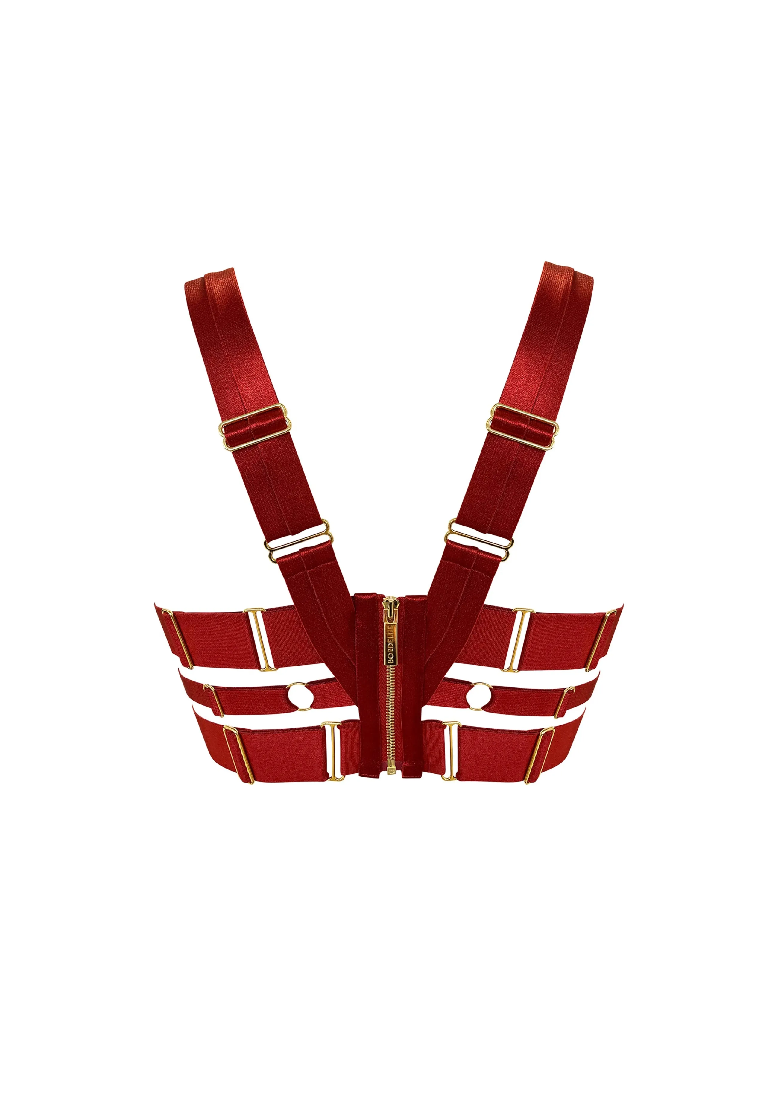 - Signature satin and wide band elastic strapping in classic Burnt Red