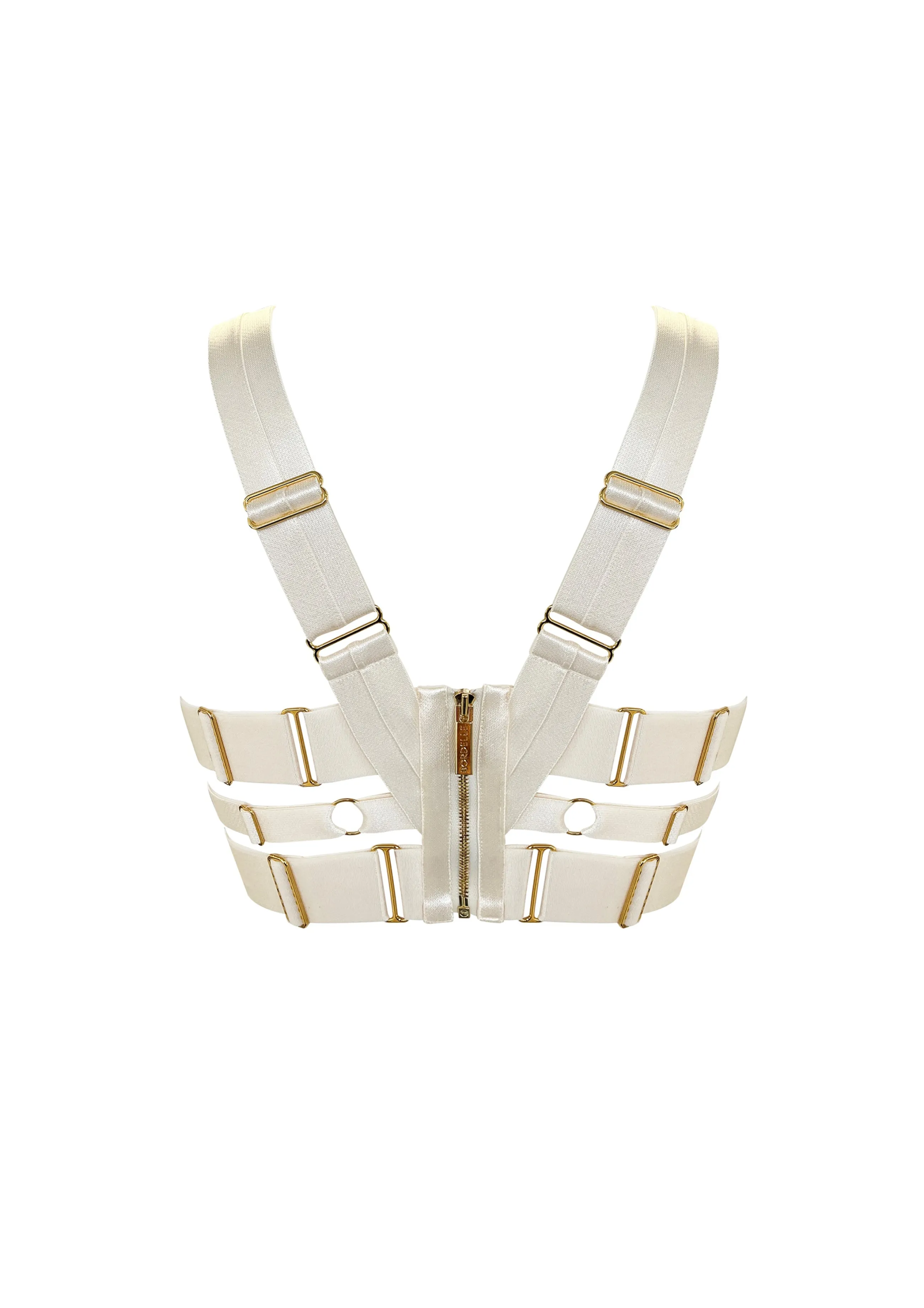 A silk satin bodice bra with lightly padded cups and a balconette wire for lift and support. The cups feature removable cookies for optional extra lift. Oversized 24k gold plated ‘O’ rings decorate the elastic panelled shoulder straps, and adjustable soft wide band elastic straps centre towards the zip fastening at the back.