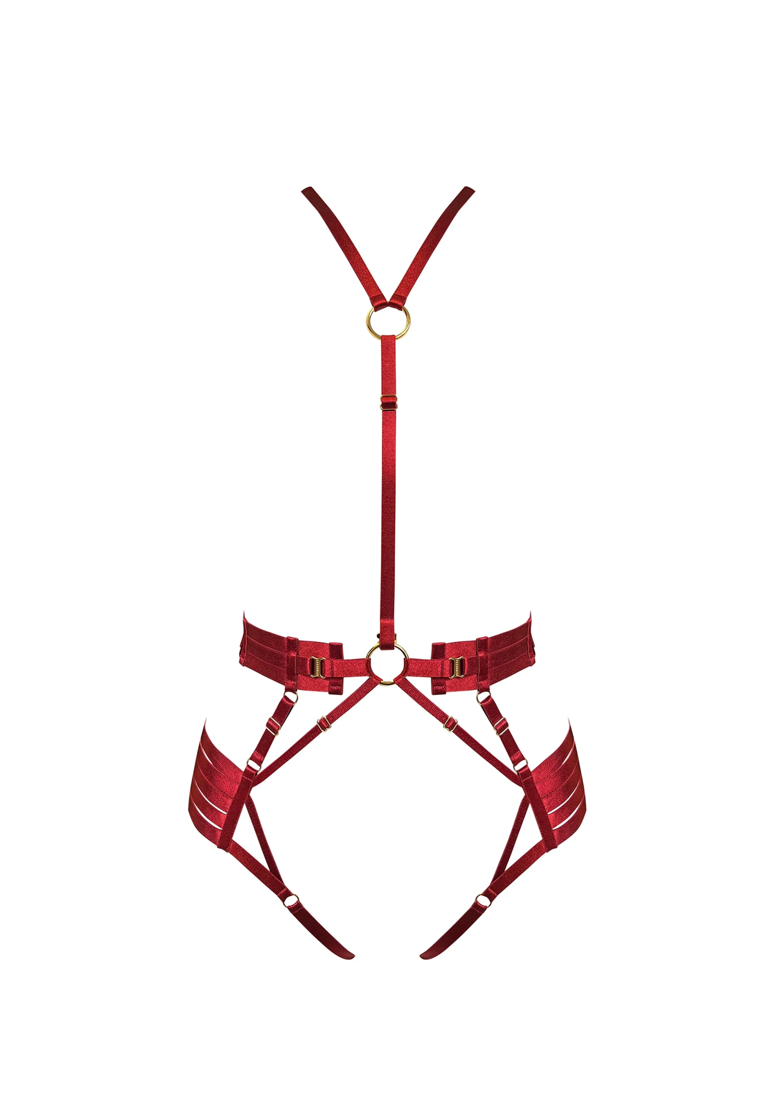 A bondage luxe body harness composed entirely of satin elastic strapping and 24k gold plated components. The detachable …