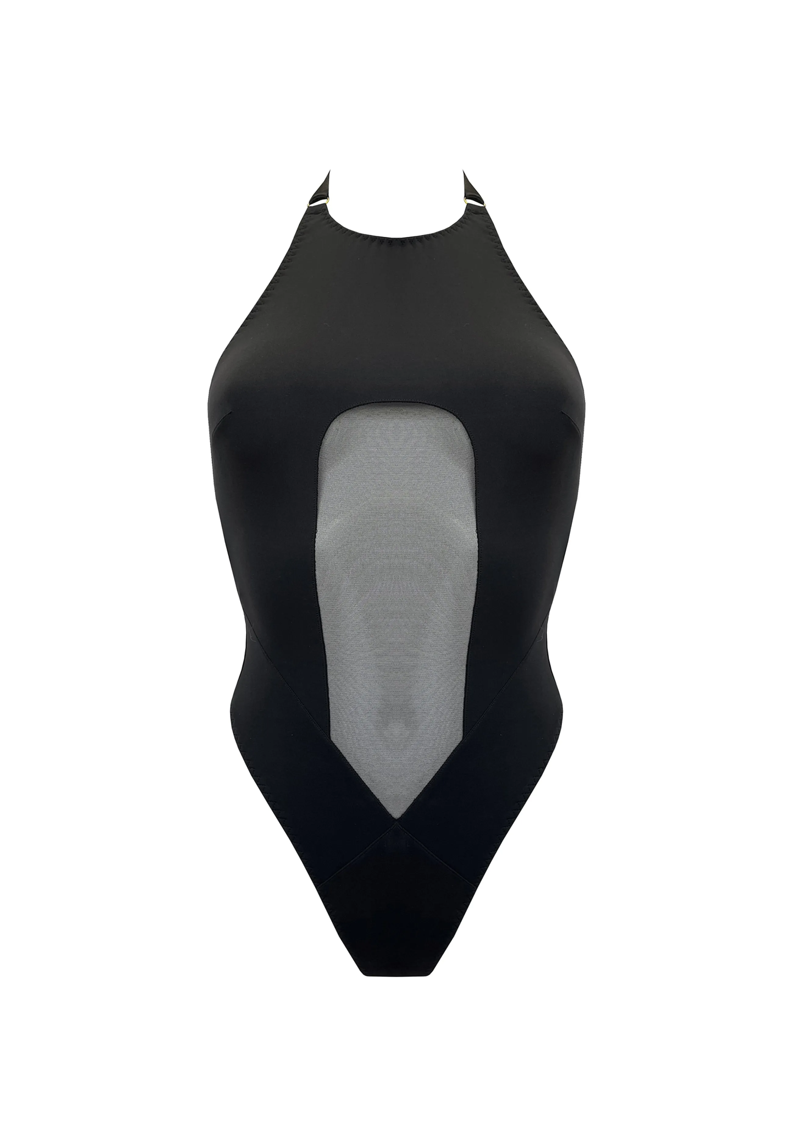 A high-neck, high-leg, super-soft opaque jersey body with flattering style lines and sheer mesh cut out. The halter neck and open back makes this piece perfect for layering and styling with outerwear.