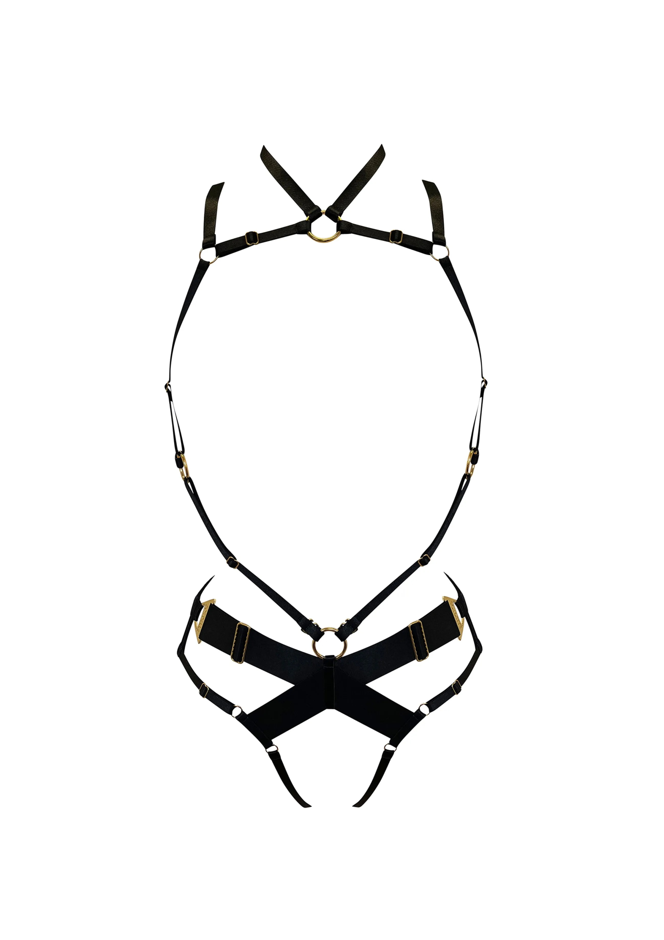 An elastic strapping bondage body harness featuring 24k gold plated components and decorative ring details. Wear as a full body harness or as a harness brief by removing the top strapping. The element symbol inspired 24k gold plated component sits on the hip as the ultimate in luxury detailing.