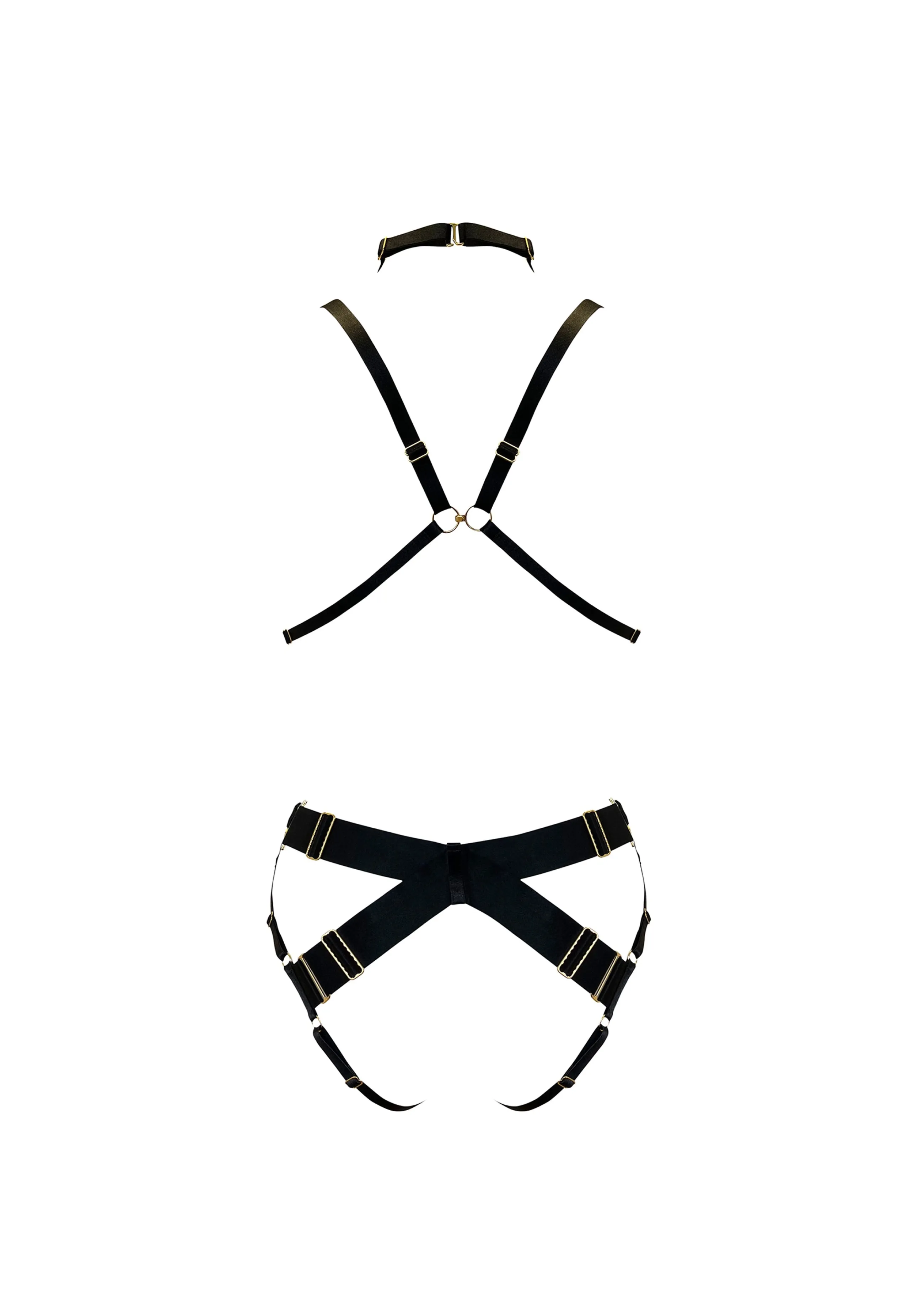 An elastic strapping bondage body harness featuring 24k gold plated components and decorative ring details. Wear as a fu…