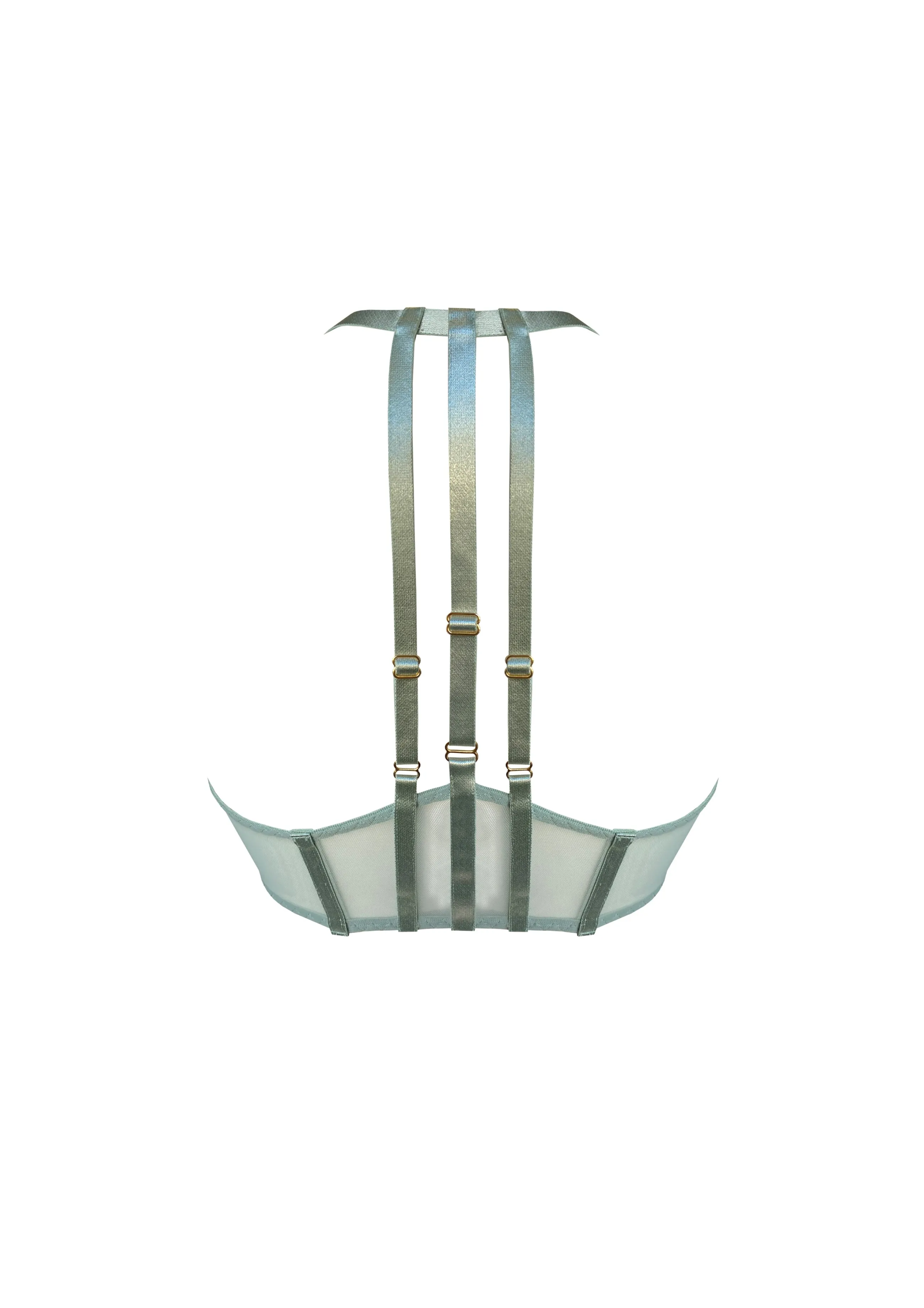 Curating a selection of popular styles, The Essentials Collection highlights our bondage-luxe aesthetic by bringing back pieces you know and love in exclusive colourways. Everyday comfort with a hint of Bordelle kink, the wrap-over soft mesh cups extend into adjustable straps secured with a 24k gold plated swan hook at the side seam. The geometric back detail highlights the Art Deco inspiration.