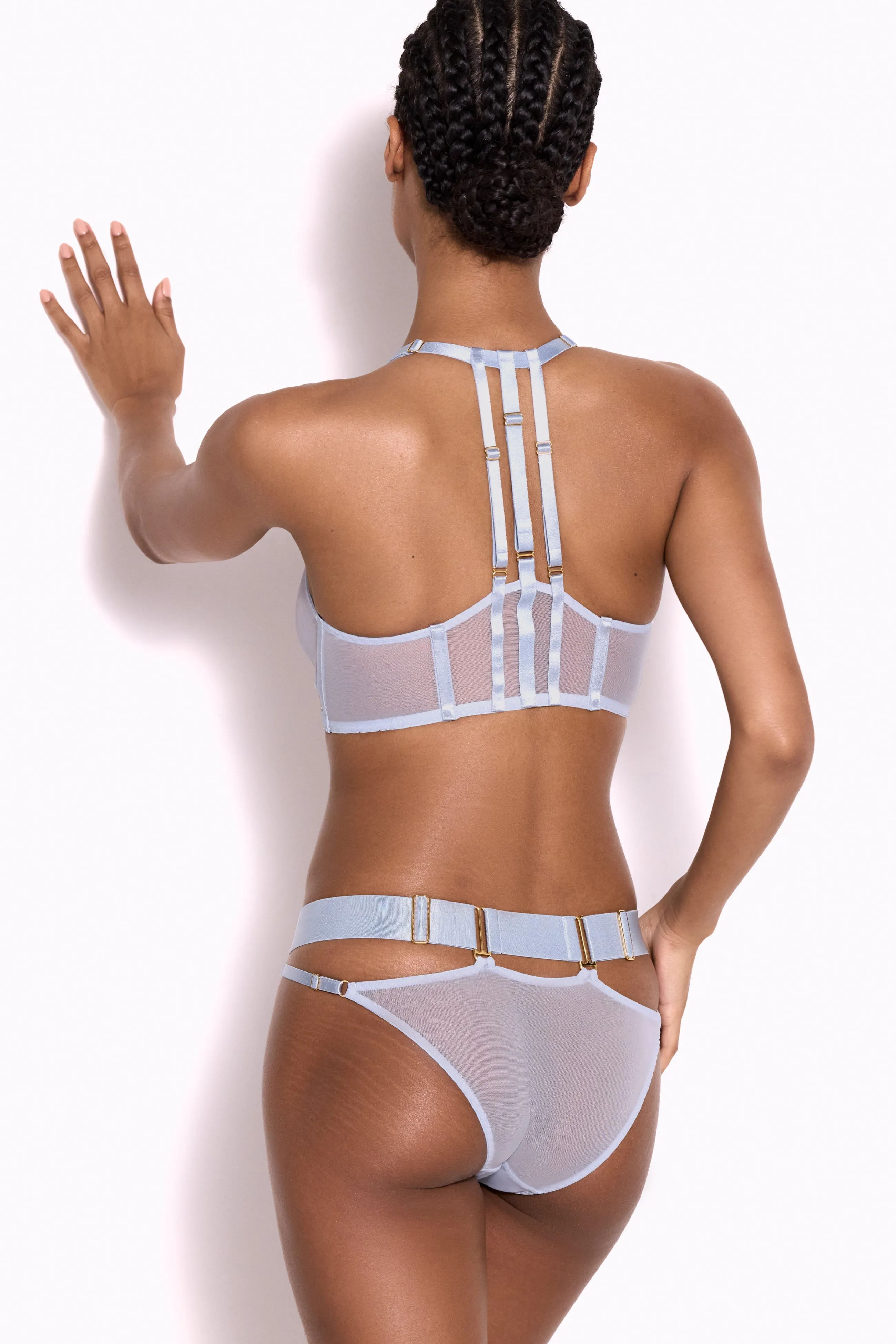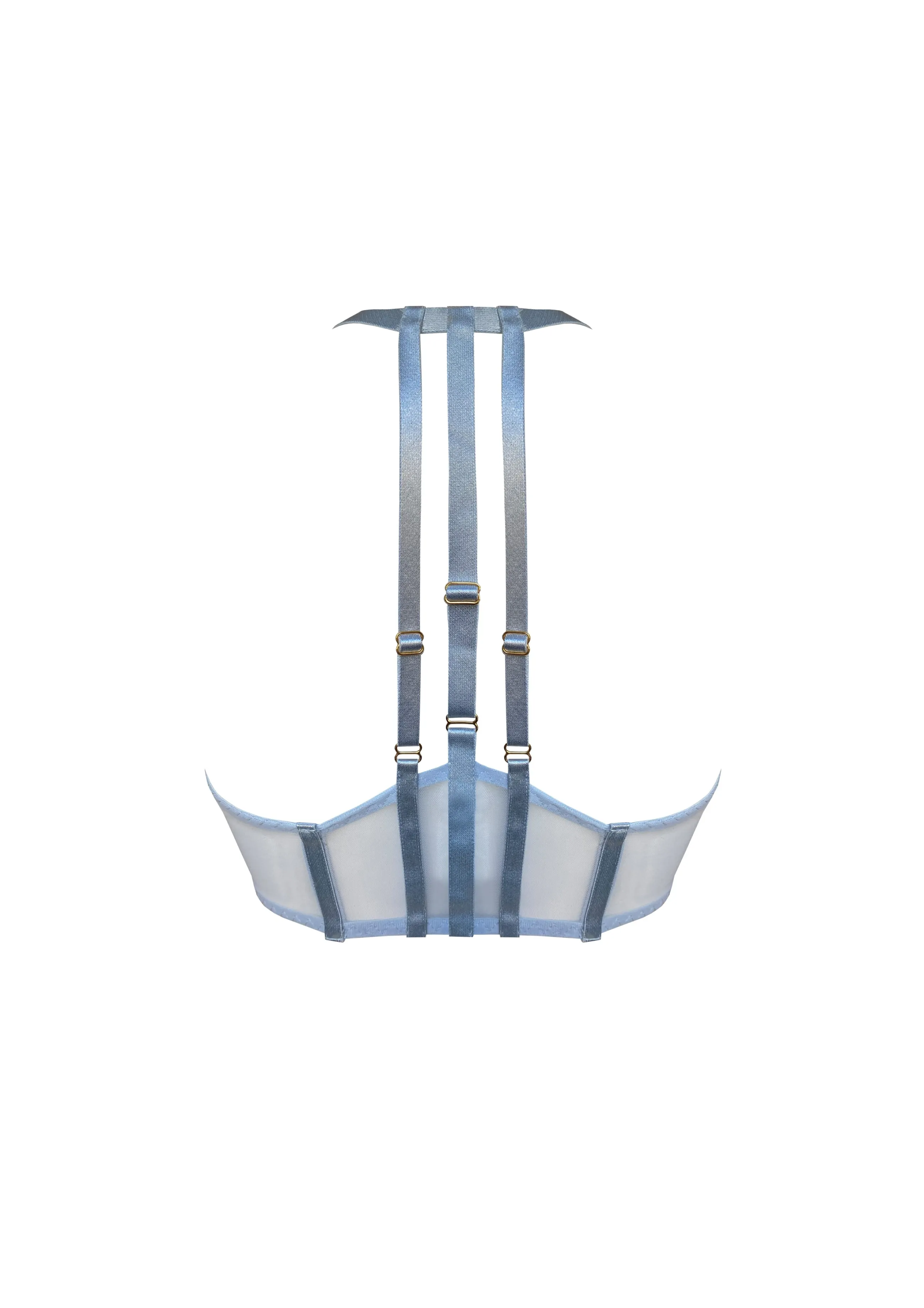 Curating a selection of popular styles, The Essentials Collection highlights our bondage-luxe aesthetic by bringing back pieces you know and love in exclusive colourways. Everyday comfort with a hint of Bordelle kink, the wrap-over soft mesh cups extend into adjustable straps secured with a 24k gold plated swan hook at the side seam. The geometric back detail highlights the Art Deco inspiration.