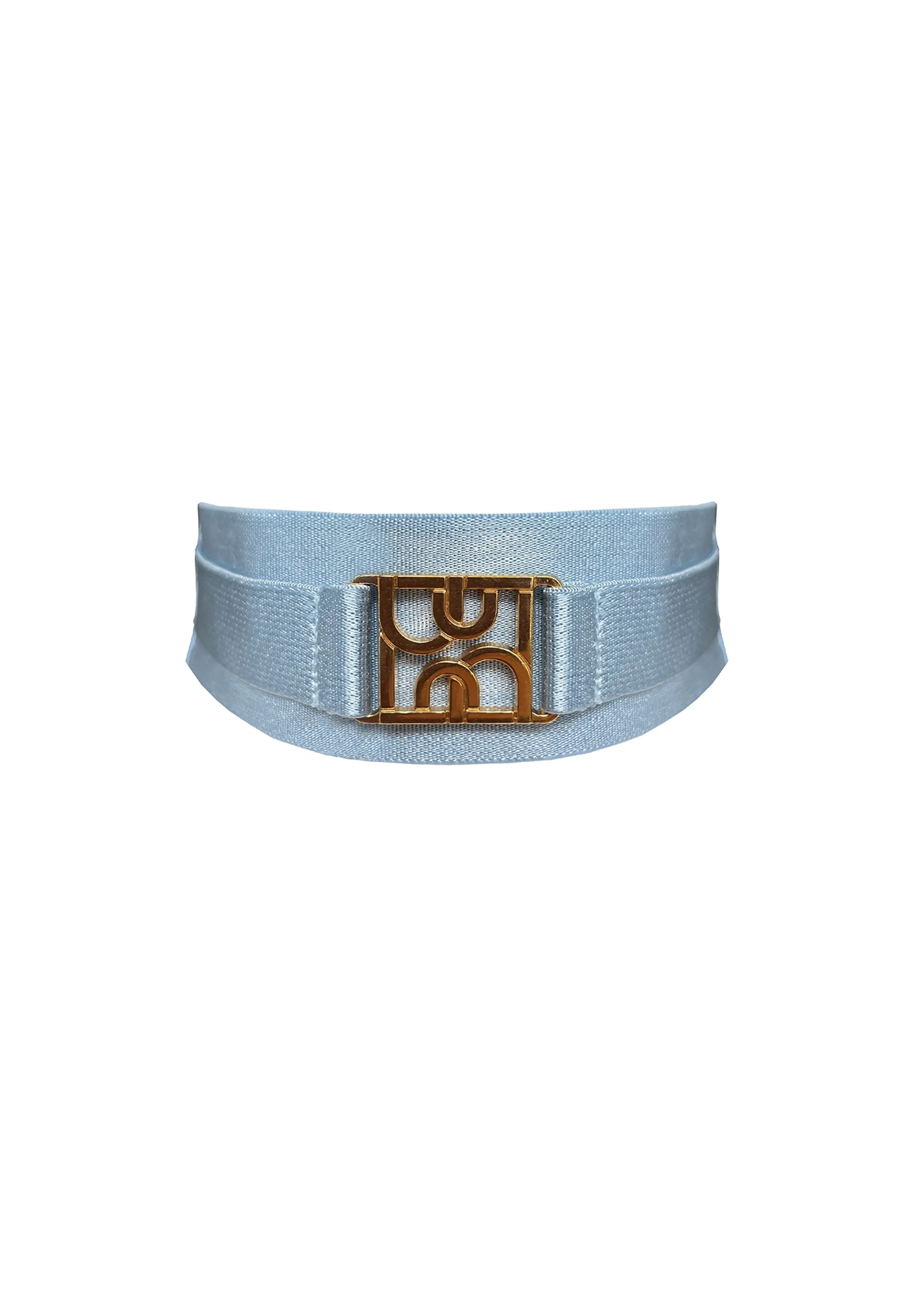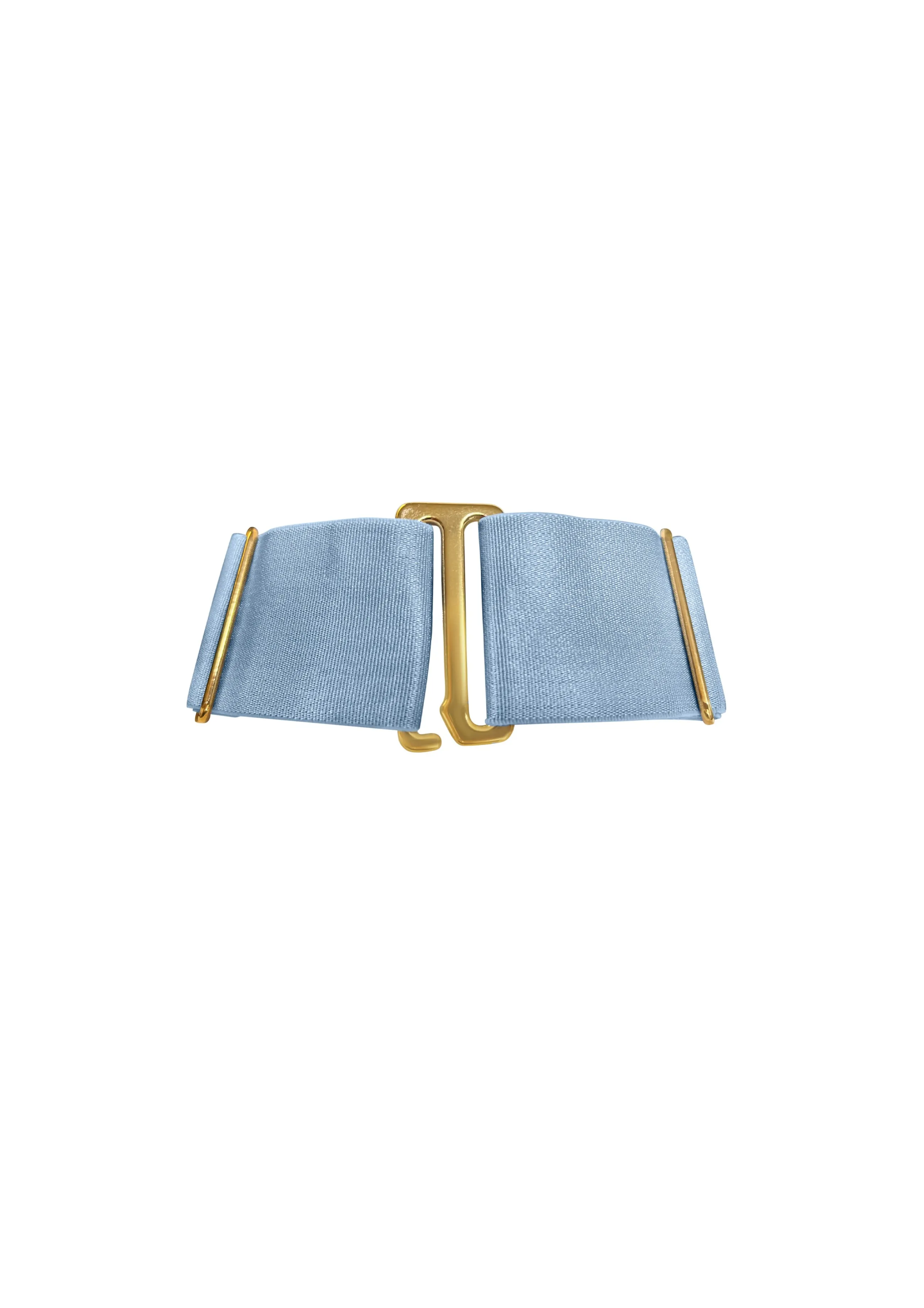 - Signature satin and wide band elastic strapping in soft Dusty Blue