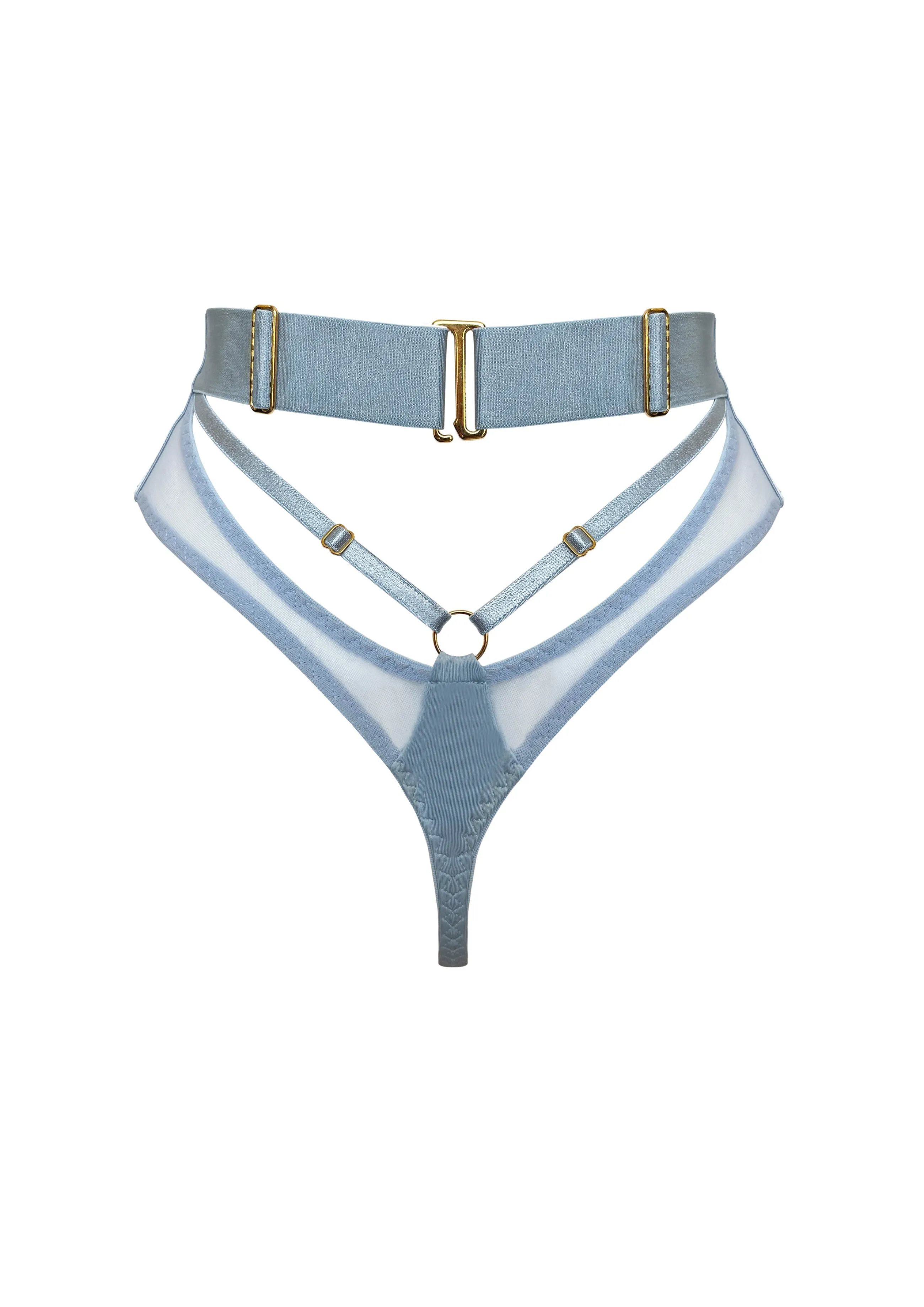 A luxuriously soft mesh high waist thong featuring satin elastic harness detailing and soft-sheen jersey panels. 24k gold plated components are used throughout, finishing at the back with an oversized swan hook fastening. The high leg design is both flattering and comfortable.