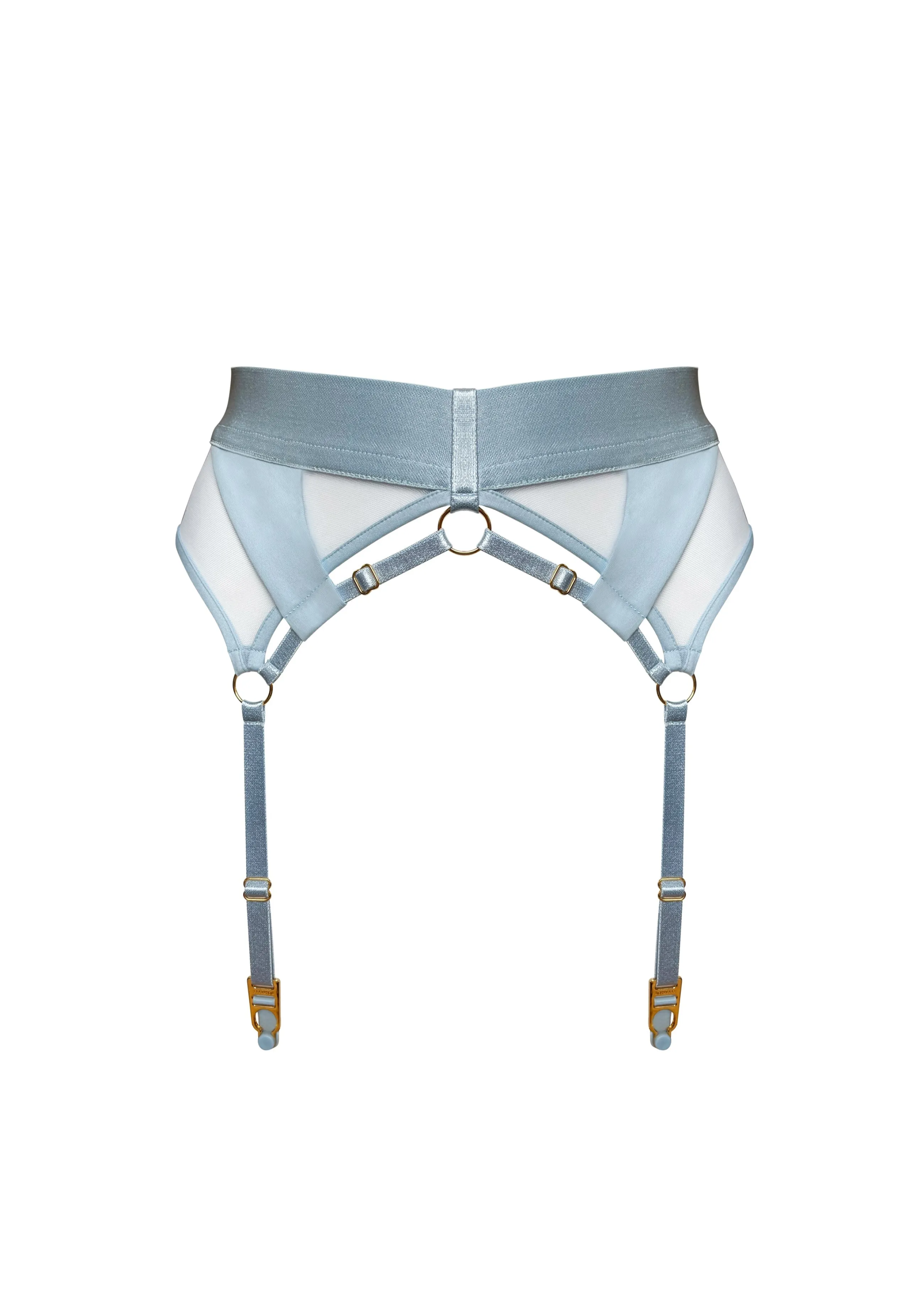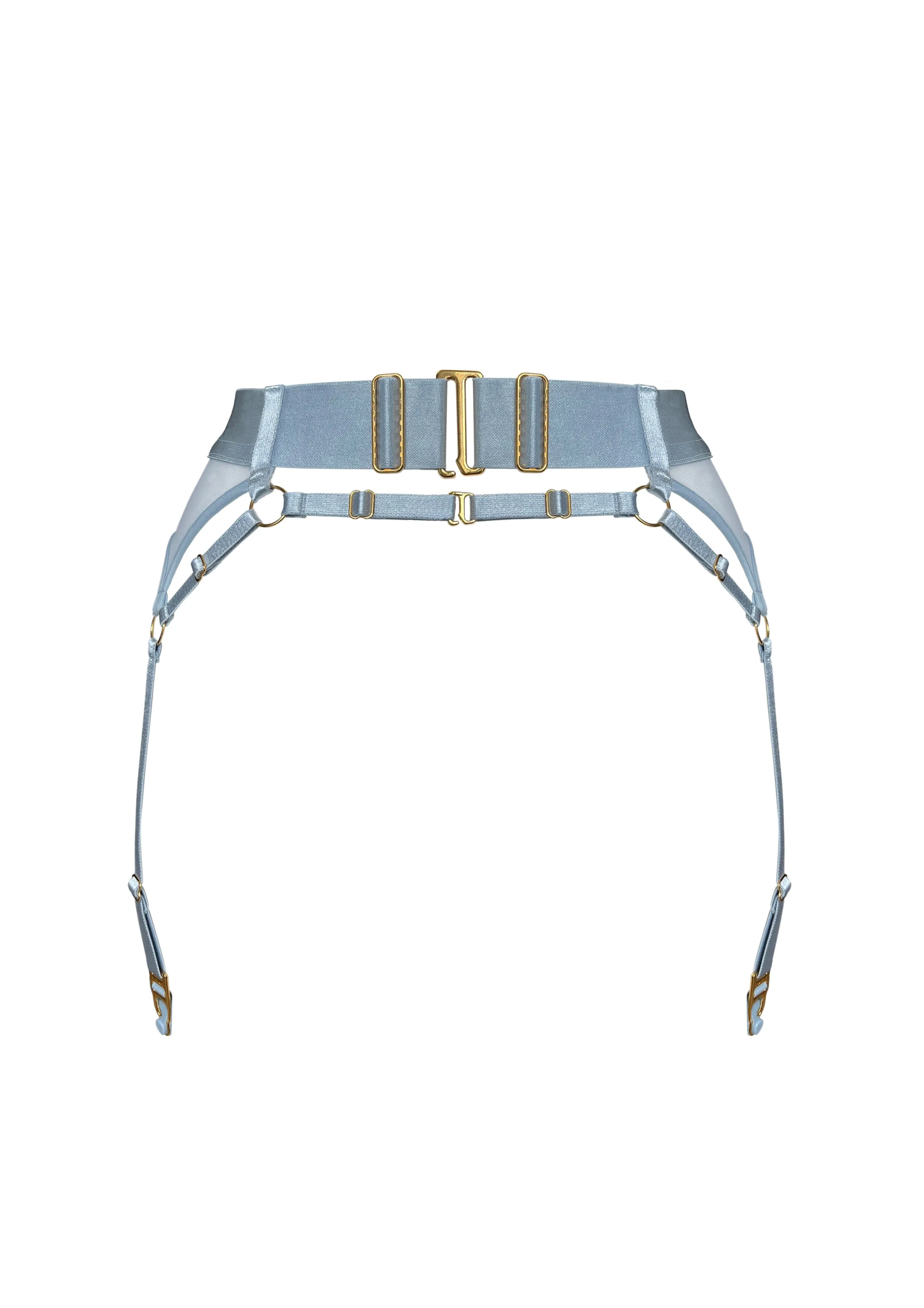 This sheer mesh suspender features eye-catching harness strap detailing and moveable soft-sheen jersey panels. The adjustable wide band elastic waistband allows for a personalised fit, fastening at the back with 24k gold swan hooks. Attach to garters via 4 branded suspender clips to complete any Vero look.